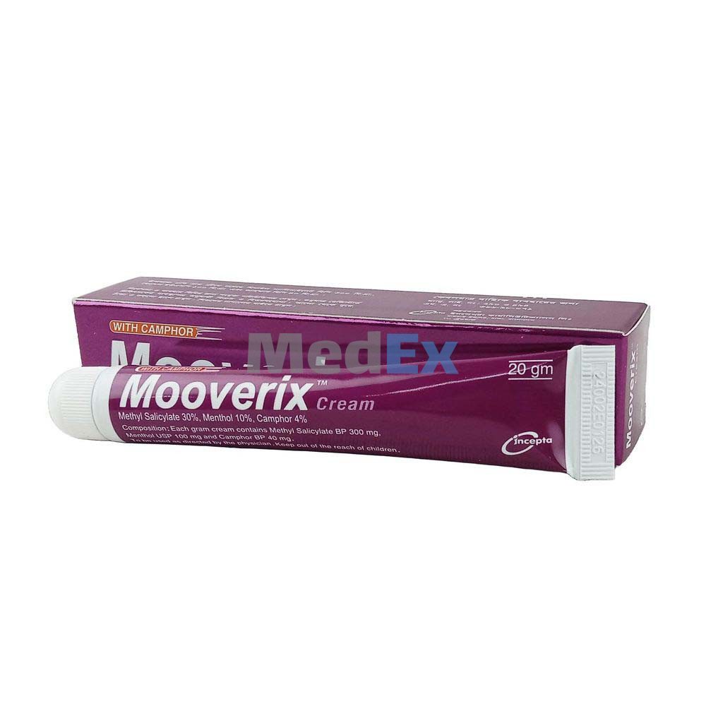Cream: This combined preparation provides temporary relief of minor aches and pains of muscles and joints associated with backache, lumbago, strains, bruises, sprains and arthritis or rheumatic pain, pain of tendons and ligaments. Several double-blind clinical studies of Mooverix containing Methyl Salicylate and Menthol have shown the effectiveness of Mooverix in counteracting minor pain of skeletal muscle stress and arthritis.