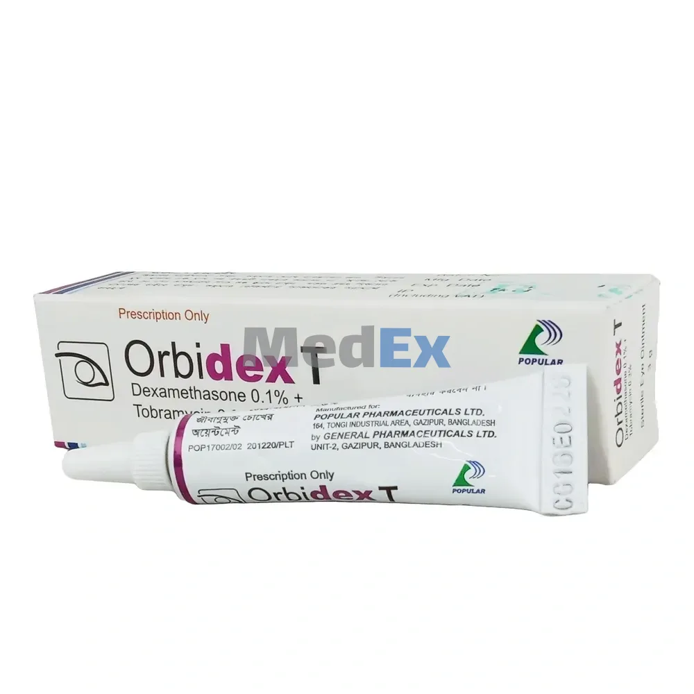 Orbidex T is indicated for steroid responsive inflammatory ocular conditions (palpebral and bulbar conjunctiva, cornea and anterior segment of the globe) where superficial bacterial ocular infection exists. It is also indicated in chronic anterior uveities and corneal injury from chemical radiation or thermal burns, or penetration of foreign bodies. The use of combination with an anti-infective component is indicated where the risk of superficial ocular infection is high.