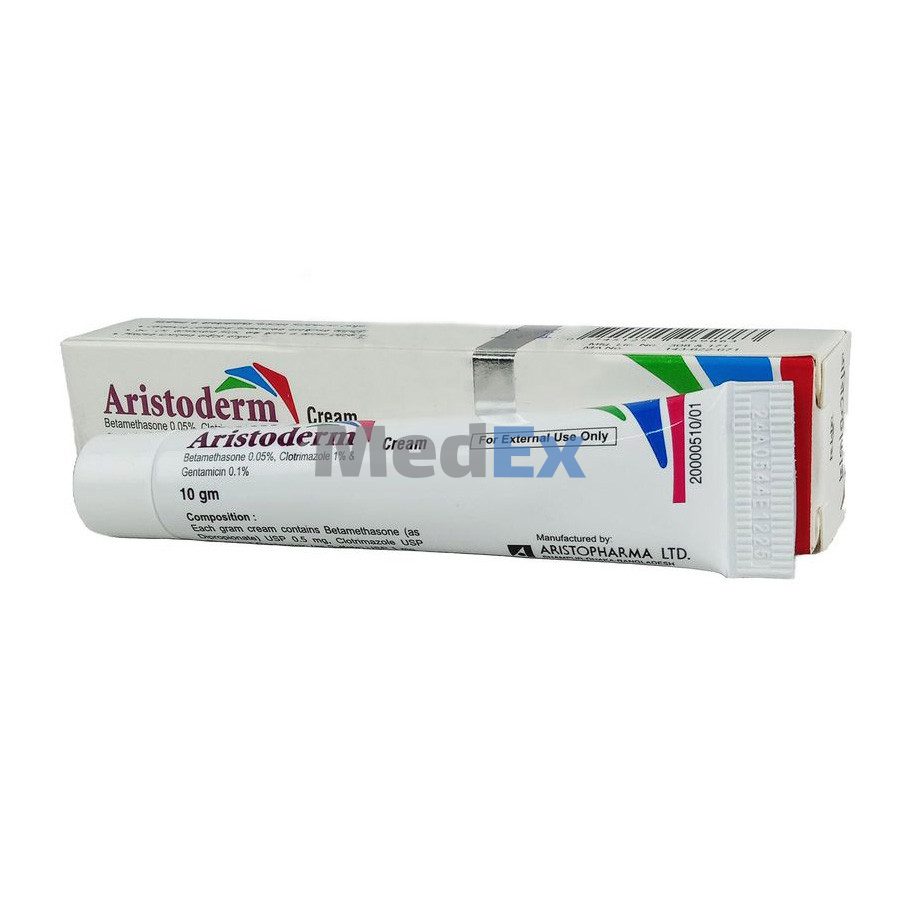 Aristoderm cream is indicated for the treatment of corticosteroid-responsive dermatoses when complicated by infections caused by bacteria and fungi. This is also effective in the treatment of tinea pedis, tinea cruris & tinea corporis, acute and chronic eczema.