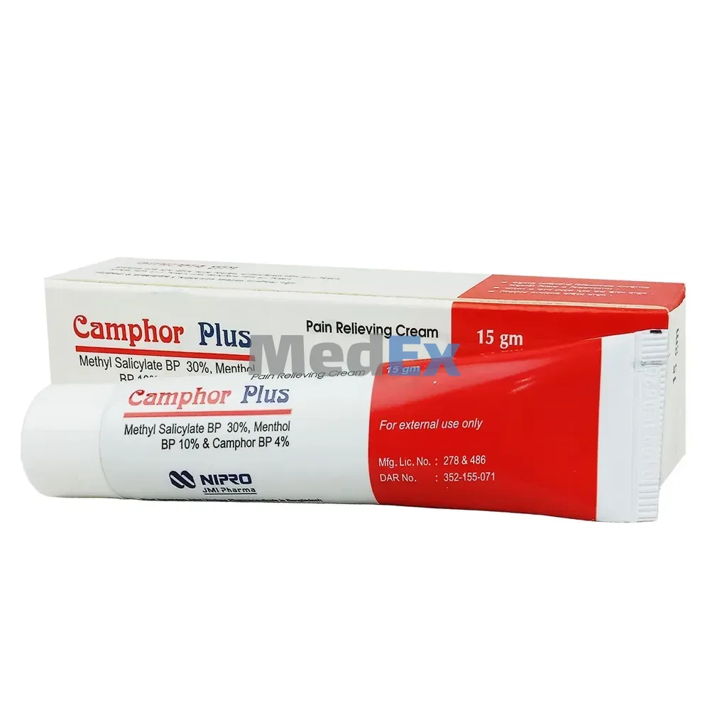 Cream: This combined preparation provides temporary relief of minor aches and pains of muscles and joints associated with backache, lumbago, strains, bruises, sprains and arthritis or rheumatic pain, pain of tendons and ligaments. Several double-blind clinical studies of Camphor Plus containing Methyl Salicylate and Menthol have shown the effectiveness of Camphor Plus in counteracting minor pain of skeletal muscle stress and arthritis.