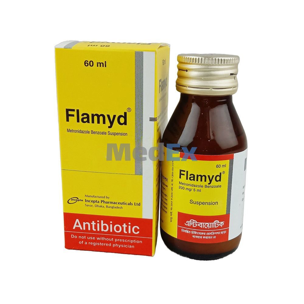 - Flamyd 200 mg/5 ml Suspension treats infections caused by bacteria and parasites.