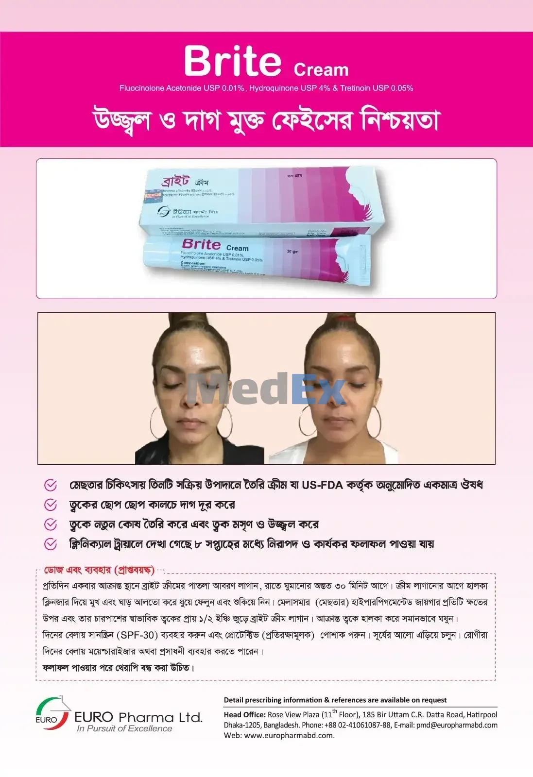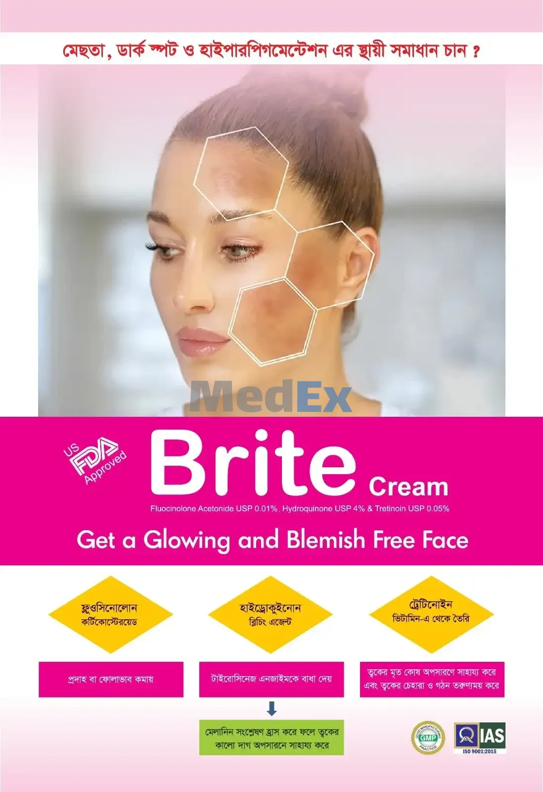 Brite cream is indicated for the short-term treatment of moderate to severe melasma of the face, after starting the treatment avoid presence of sun. Use a sunscreen of at least SPF 30 or more.
