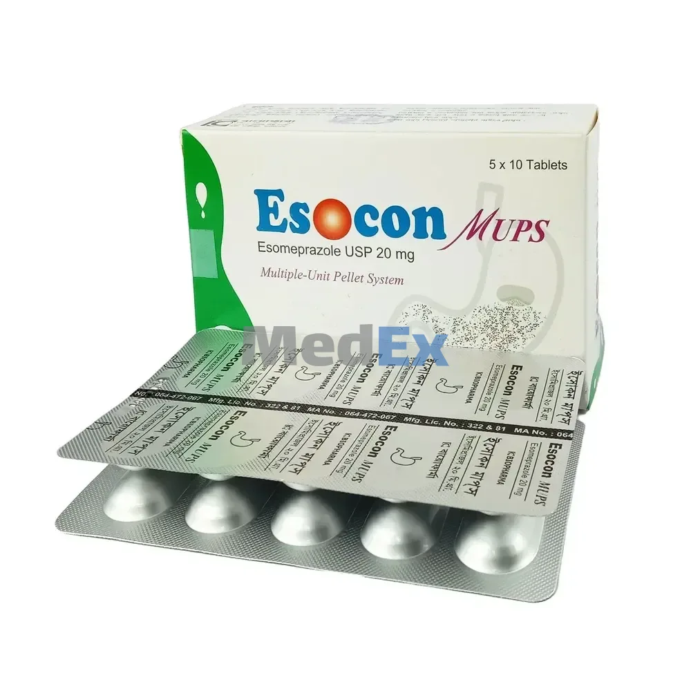 Esocon MUPS 20 mg MUPS Table is a proton pump inhibitor (PPI). PPIs work by reducing the amount of acid produced in the stomach. Esocon MUPS 20 mg MUPS Table is used to treat gastroesophageal reflux disease (GERD), ulcers, and other conditions that involve too much stomach acid.