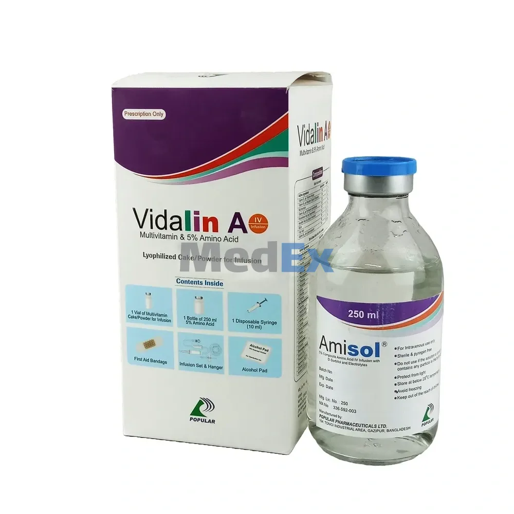 Vidalin A IV is intended as a supplement for intravenous nutrition in order to meet the daily requirements of the water-soluble vitamins and protein.