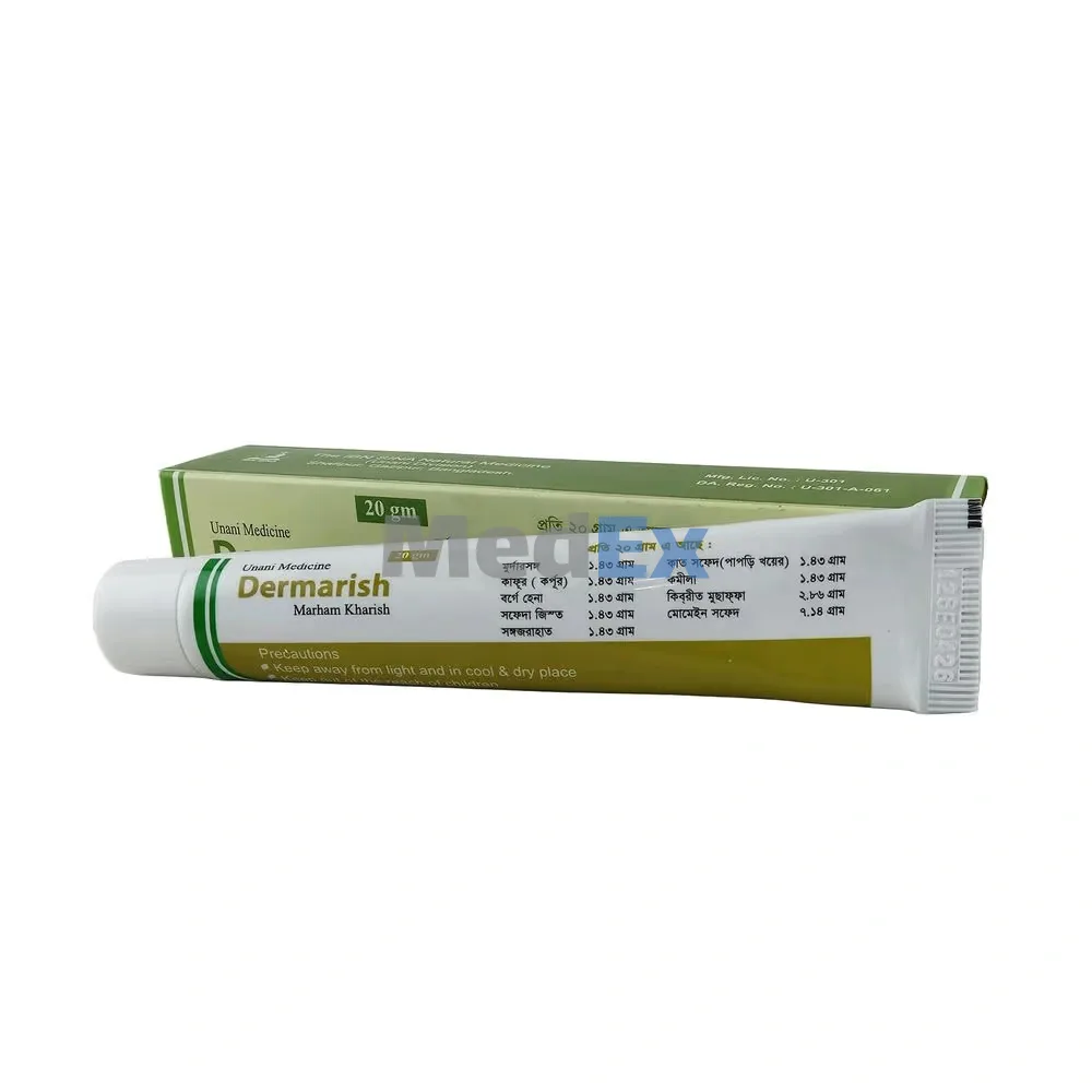 Marham Kharish is a unique combination of Camphor (Cinnamomum camphora), Henna (Lawsonia inermis), Catechu (Acacia catechu) and others natural ingredients. It acts as antiseptic, anti-inflammatory and anti-microbial. Marham Kharish is very effective in scabies, itching, pustular, piles, boils, eczema and proriasis.