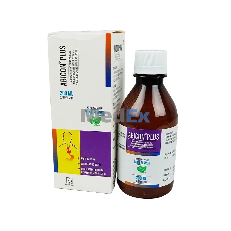 Abicon Plus (500 mg+267 mg+160 mg)/10 ml Suspension is the combination of two antacids and an alginate. This is commonly used to treat Gastric reflux, Heartburn, Indigestion, Flatulence associated with gastric reflux.