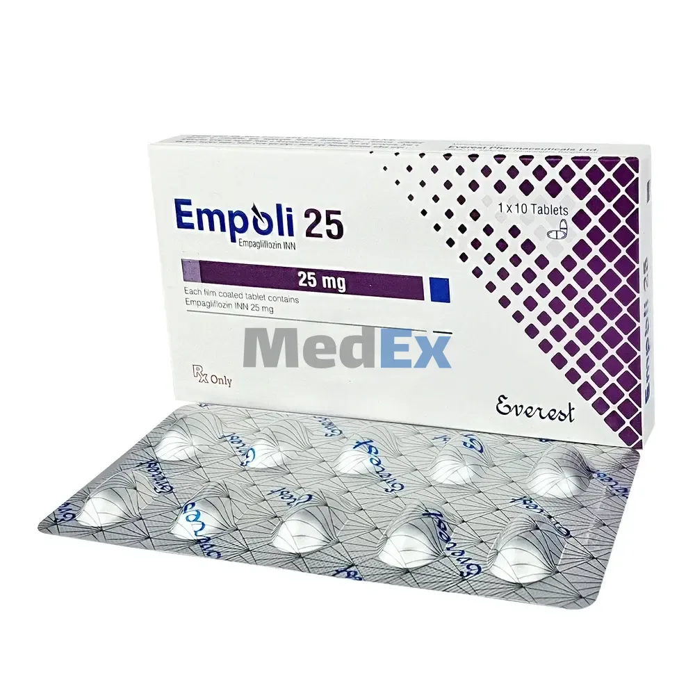 Empoli 25 mg Tablet is a SGLT-2 inhibitor which reduces the reabsorption of glucose from kidney.