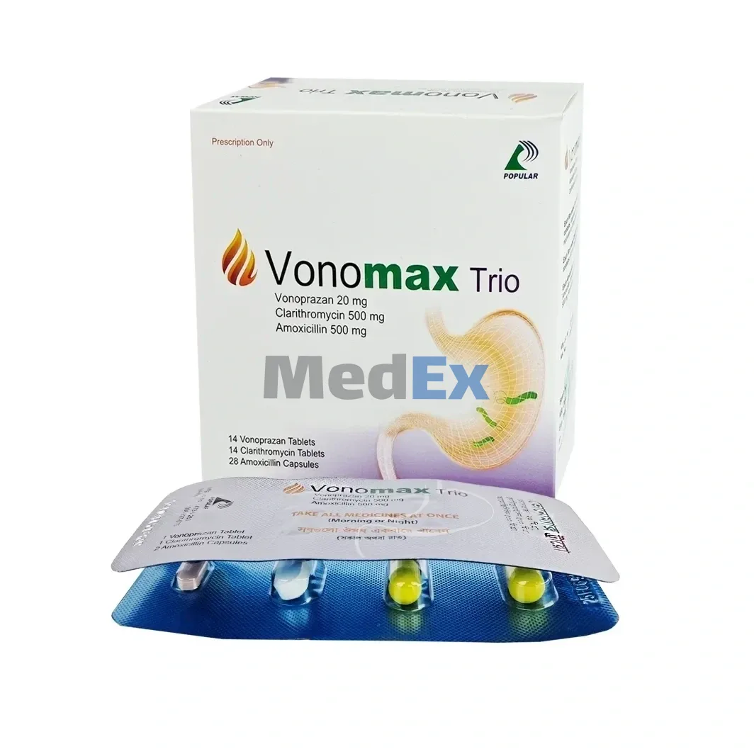 Vonomax Trio, is a standard triple therapy regimen, is indicated in the eradication of H. pylori in active chronic gastritis, duodenal and gastric ulcers.