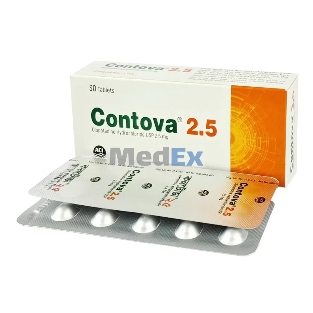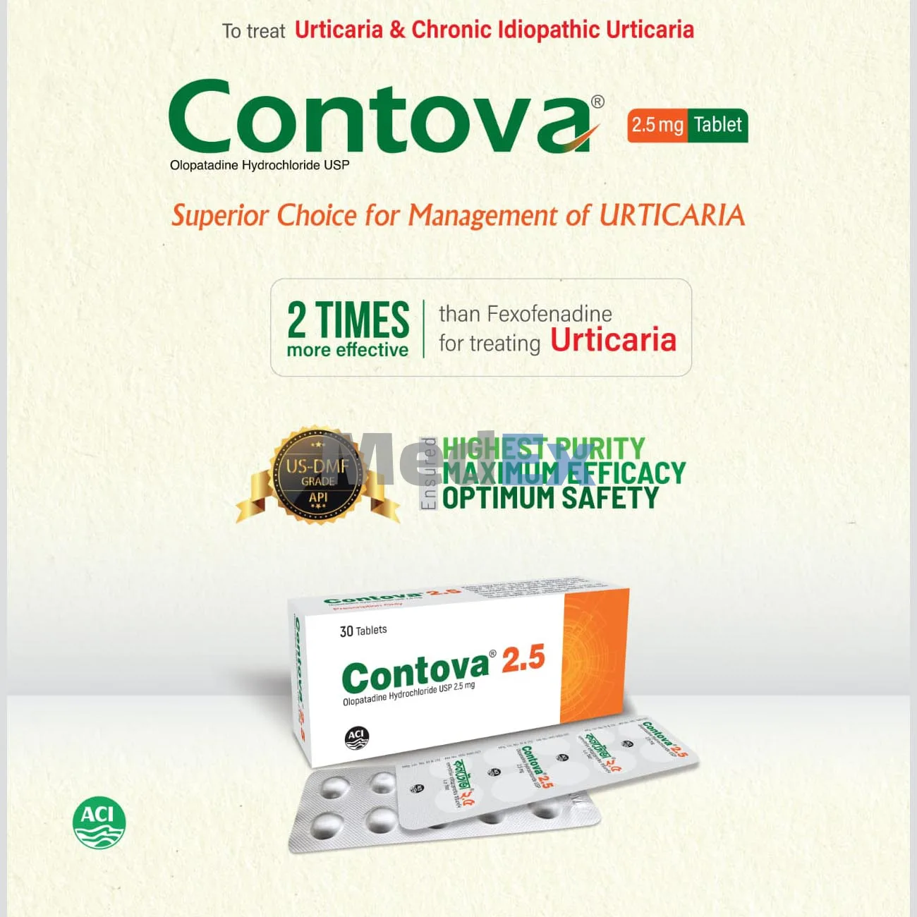 Contova tablet is indicated in the treatment of allergic rhinitis (swelling of the nasal membranes caused by an allergy to pollen and mold spores in the air) and allergic skin conditions. It helps to relieve allergy symptoms such as skin rashes, swelling, hives (itchy, painful eruptions that sting), itching, sneezing, runny or stuffy nose.