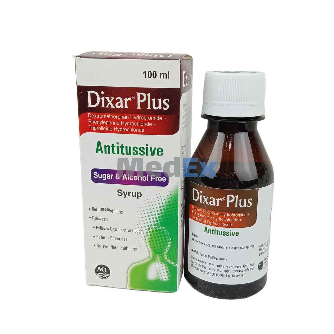 Dixar Plus may cause drowsiness. If affected, do not drive motor vehicle or operate machinery. Avoid alcoholic drink while on this medication. Use with caution in patients with epilepsy, prostatic hypertrophy, glaucoma, hepatic disease, hypertension, heart disease, diabetes, hyperthyroidism, patients with stenosing peptic ulcer, pyloro-duodenal obstruction or bladder neck obstruction, unless under the medical advice and supervision. If symptoms do not improve within one week or accompanied with high fever, consult a physician before continuing use.