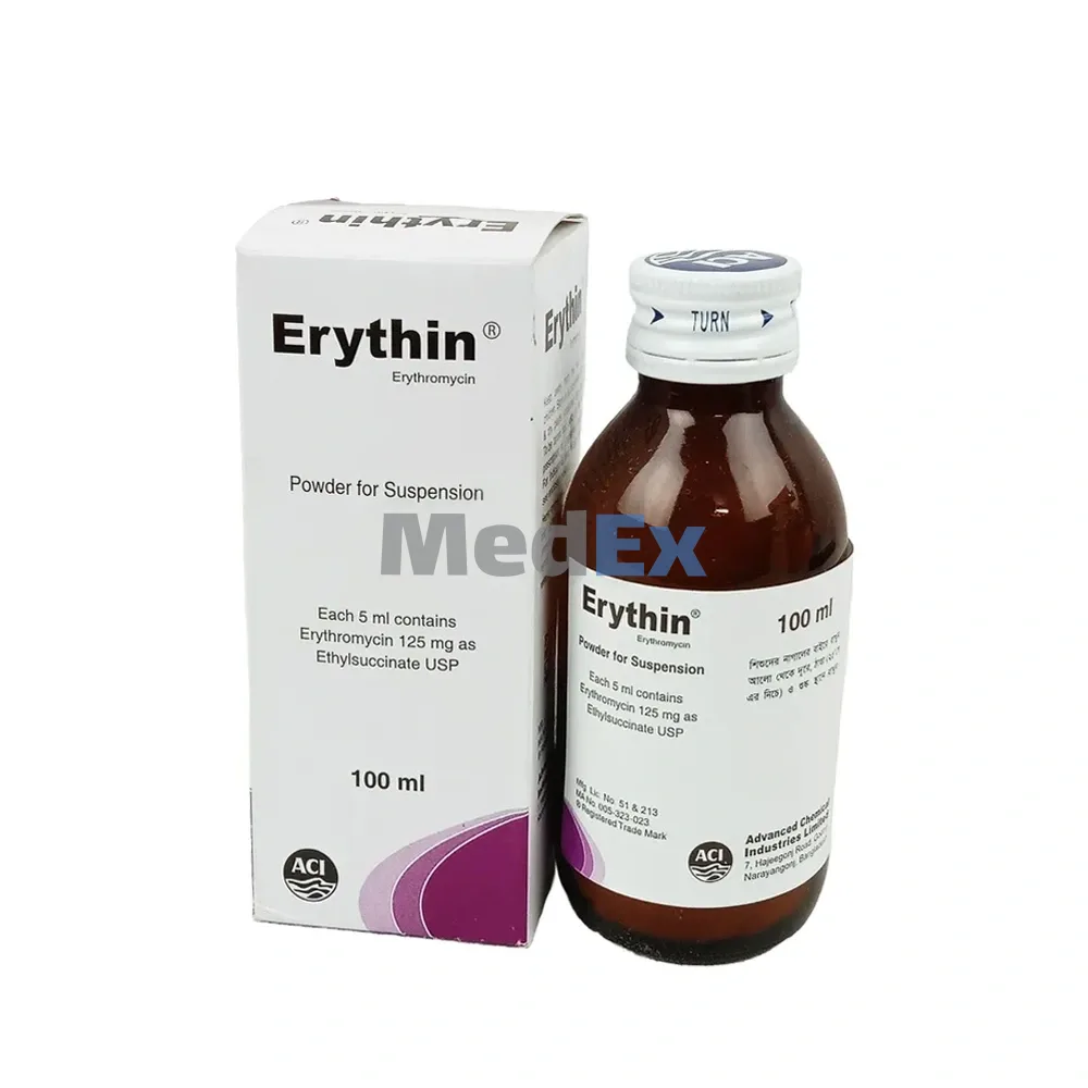 Erythin belongs to the macrolides group of antibiotics. It exerts a bacteriostatic or bactericidal action based on specific interference with ribosomal protein synthesis within the bacterial cell. THROCIN is mainly used for the treatment of infections caused by penicillinase producing staphylococci. The following micro-organisms are particularly susceptible to Erythin. Gram (+)ve : Cocci and bacilli. Gram (-)ve : Neisseria catarhalis, N.meningitis, N.gonorrhoea, Haemophilus influenzae, Brodetella, H. pertussis.Other micro-organisms : Mycoplasma pneumoniae, Legionella pneumophila, Bacteroides fragilis, B.oralis, B.melaninogenicus, Fusobacterium, Chlamydia trachomatis, Treponema pallidum.